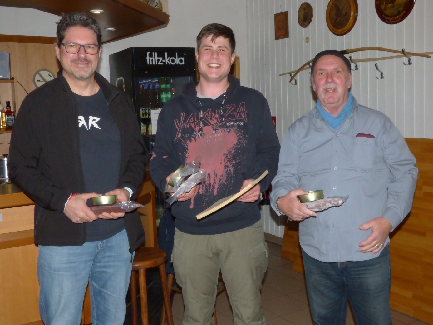 Die drei Erstplatzierten: Der erste Platz geht an Hagen Kaufeld mit 346 Punkten, Zweitplatzierter ist Reinhard Hixt mit 320 Punkten und als Dritter durfte sich Uwe Schirmer mit 230 Punkten über kleine Siegergeschenke in Form von Wurstwaren freuen. Sogar der Schütze am Tabellenende erhielt für seine minus 70 Punkte einen Trostpreis. Aber niemand sollte über seine Platzierung betrübt sein, denn im Vordergrund der Veranstaltung standen ohnehin der Spaß und die Geselligkeit.